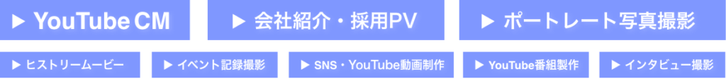YouTube CMの制作や会社紹介・採用PVなどを企画・提案・撮影・編集・納品まで藏𠩤潔司がトータルプロデュースします。そのほか写真撮影なども承っております。